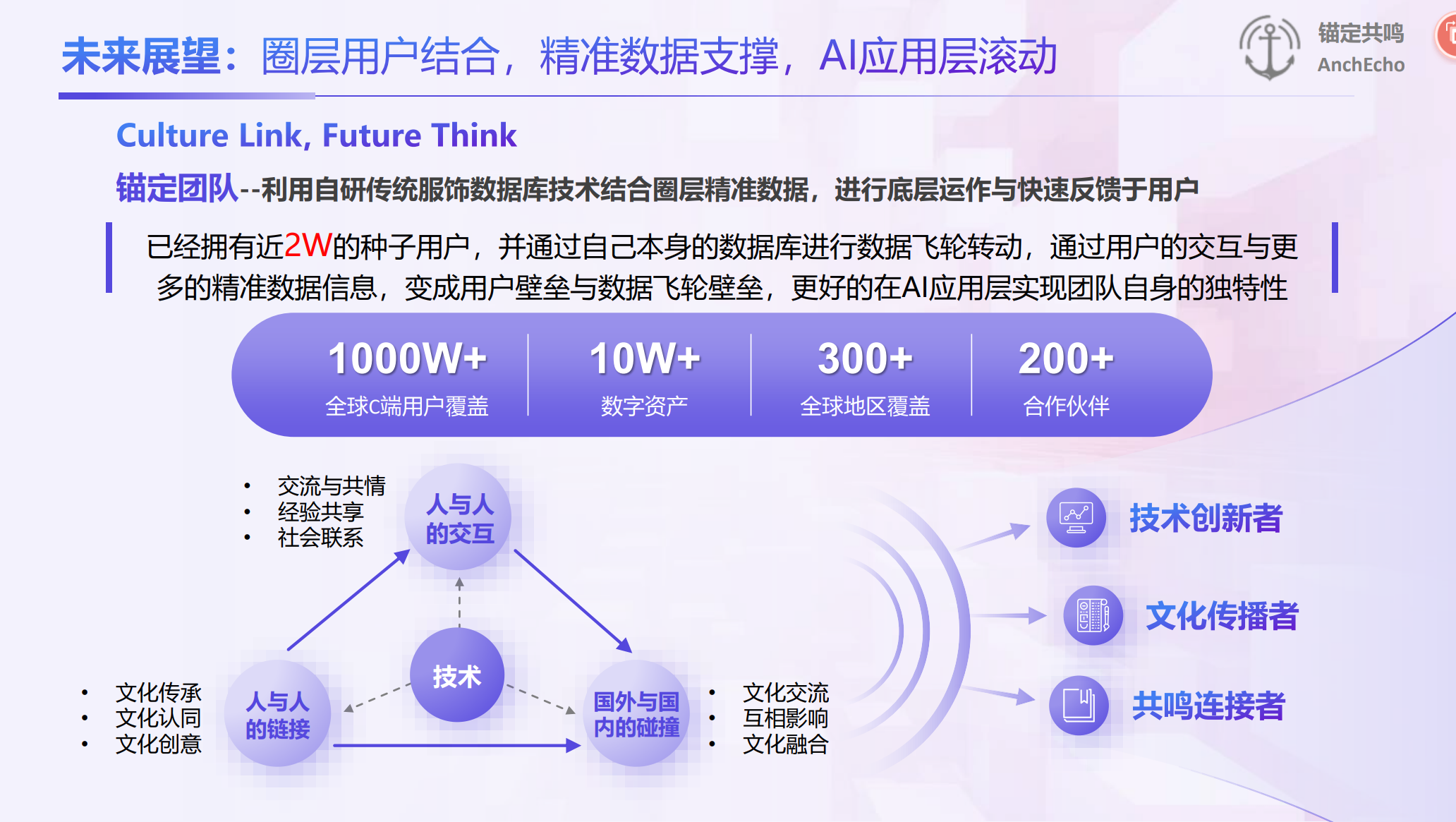 锚定共鸣(上海)科技有限公司以AIGC、区块链及数字孪生技术为核心,专注文化资产数字化与RWA融合创新,依托自研CulturalLink RFID、AIGC内容引擎和区块链数字底座,为地方政府、传统企业及C端圈层用户提供全链路服务,涵盖文化数据资产构建、IP数字化运营等。