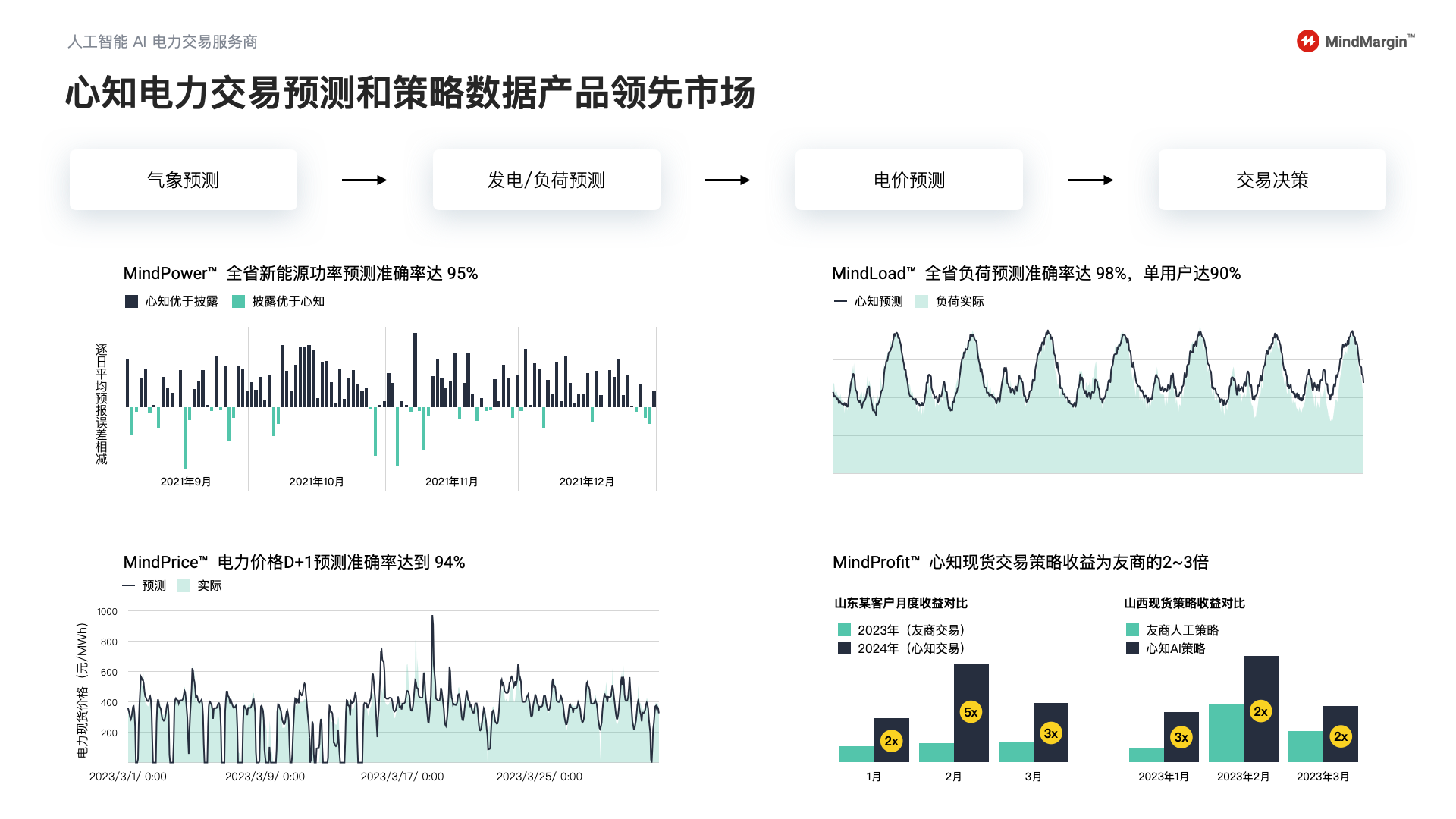 心知科技基于能源电力与气象大数据,运用高精度气象预报、人工智能AI和金融量化交易技术,为发电、售电和工商业企业提供电力交易智能决策数据、SaaS软件、交易策略及能源管理服务,助企业获电力交易最大收益,解决电网供需不平衡问题,提高新能源发电利用率,减少“弃风弃光”,助力全球能源转型与“碳中和”。目前,心知科技为山东、辽宁、广西等8个省份客户提供电力交易数据软件和代理交易服务,代理交易运营电量规模达150亿度/年,为客户平均提效1分/度。其AI电力交易技术收益率是人工交易的2-3倍,领先市场。