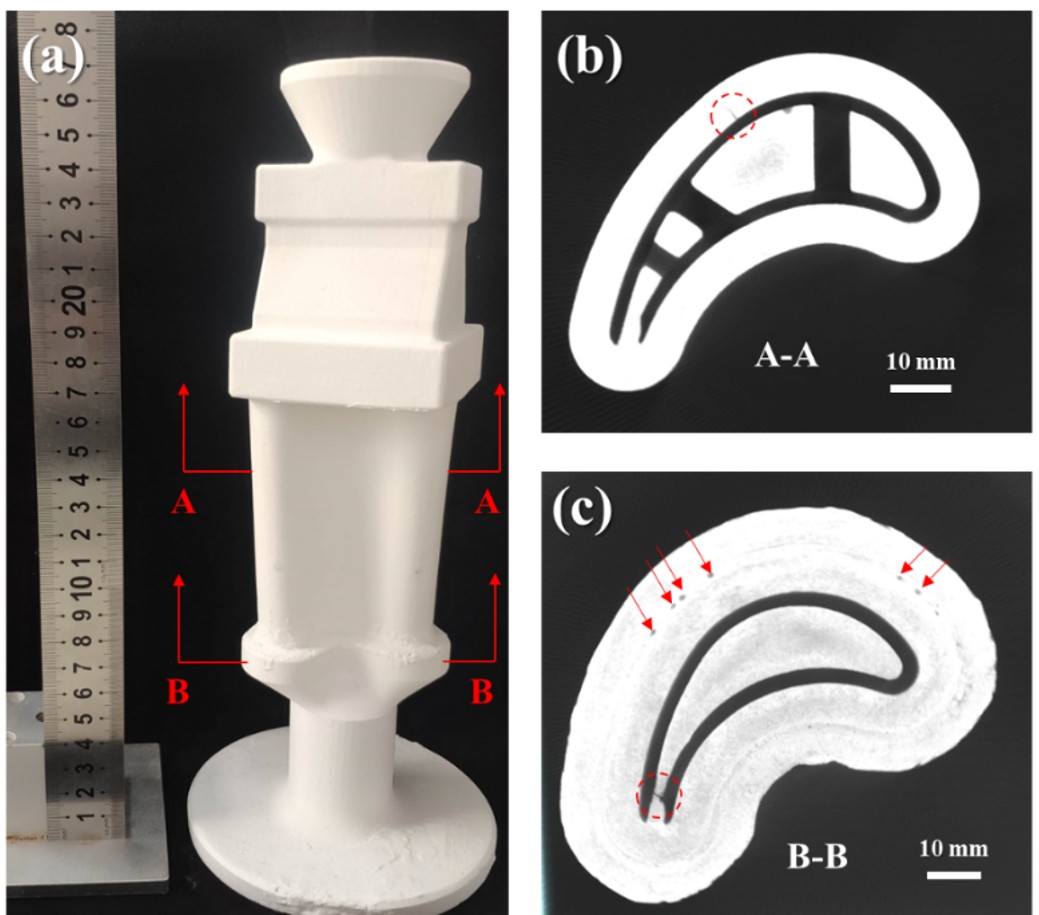 面向陶瓷型芯型壳的一体化制造,研发出高品质的多种陶瓷浆料,研制出多材料陶瓷3D打印装备样机,制造出陶瓷型芯型壳一体化样件。研发多成形缸、可移动工作平台,研发多材料3D打印控制软件,研究智能信息采集、工艺分析一体的软硬件集成技术。基于多缸送料、紫外光固化、回收清洗技术的多种陶瓷材料3D打印。在确定最佳固相含量后,将多种陶瓷材料的浆料通过多缸送料的方式送入3D打印机的料槽中,并将整个面的激光聚焦到陶瓷材料浆料的表面,使其按照3D打印模型的几何结构完成打印过程,对多余的陶瓷材料浆料进行清理和回收,以作后期陶瓷材料的研究,再通过自主研究的脱脂和烧结制度获得具有优异性能的陶瓷材料,实现多种陶瓷材料制备的智能化。